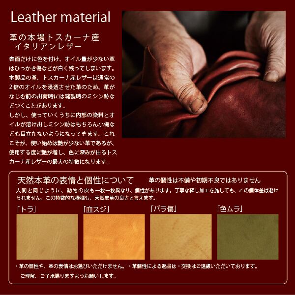 素材には、イタリア・トスカーナ地方の植物タンニンなめし革を採用。国内工房の熟練職人が、一点ずつ丁寧に仕立てた逸品です。