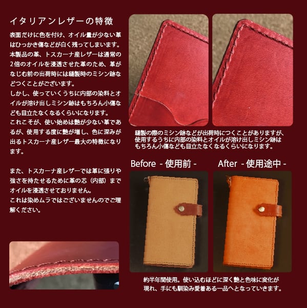 ※この革は革本来の表情を生かすため、化粧をしていない素上げの革になっています。生きていた証のキズやトラ、色ムラなどが入ることがありますが、商品の特性上の為ご了承ください。また、染料で染めているため、濡れたり摩擦などにより色移りなどをする場合がありますので使用の際は十分ご注意ください。