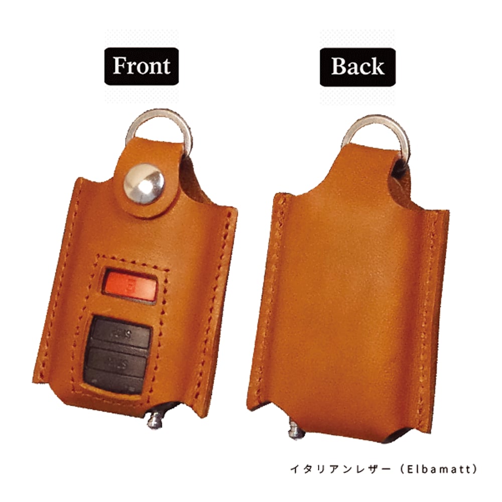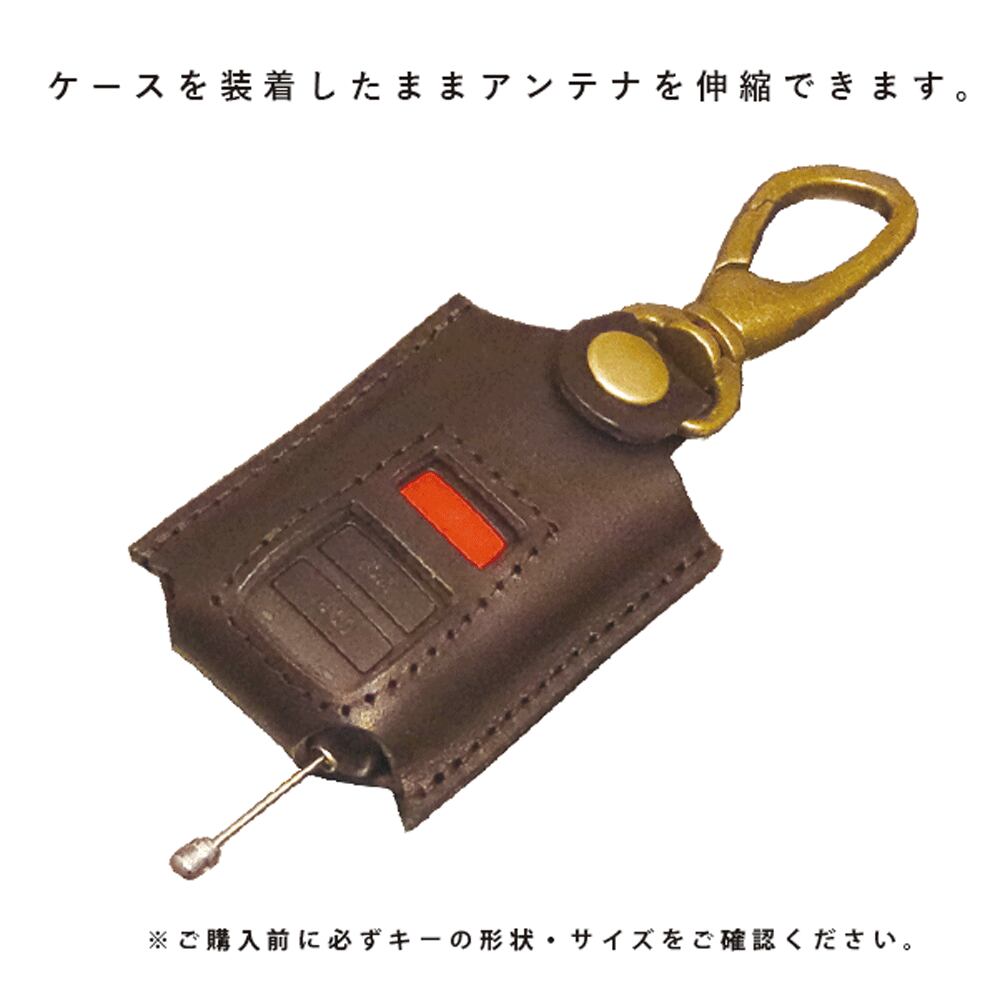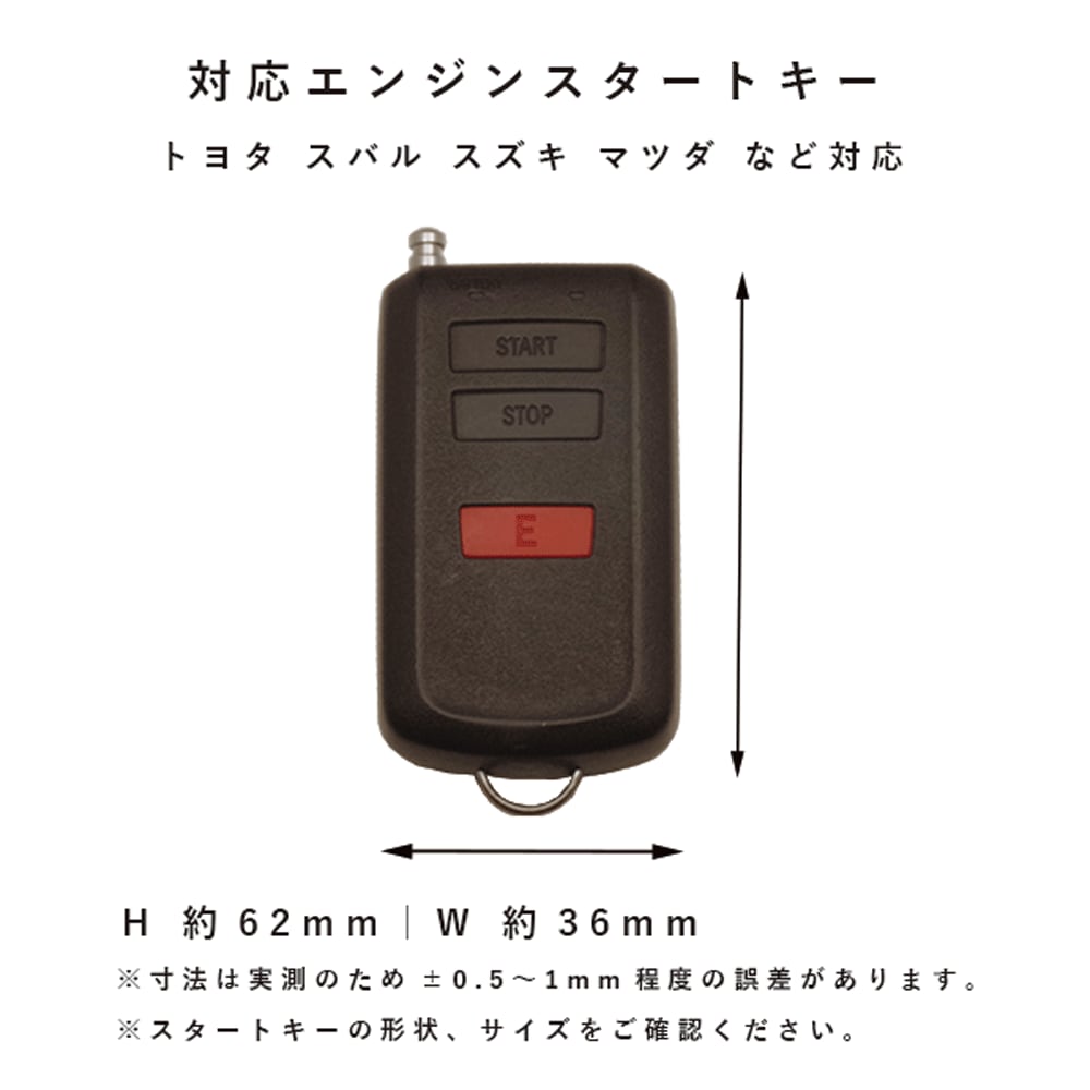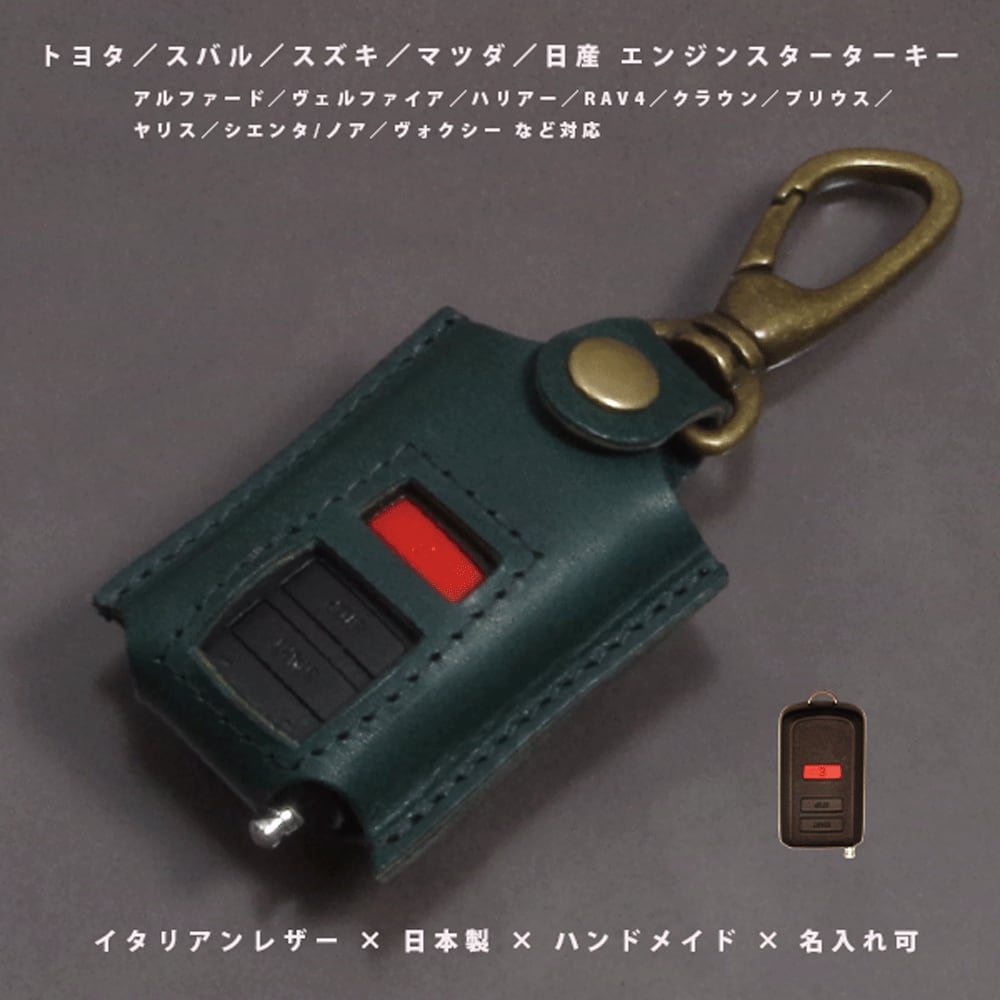 トヨタ・スバル・ダイハツ・マツダ・日産・三菱の幅広いメーカーに採用されている、赤い「E」マークと START/STOP ボタン付きリモコン(縦62×横36mm)専用に設計した本革キーケースです。