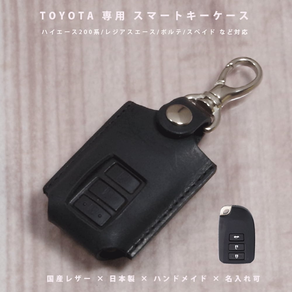 トヨタ ハイエース・レジアスエース・ポルテ・スペイド対応の国産レザースマートキーケースです。大切なキーを美しい本革で包み、色・ステッチ・金具までカスタム可能。名入れ刻印(10文字まで)にも対応し、納車祝いや誕生日プレゼントにも最適です。